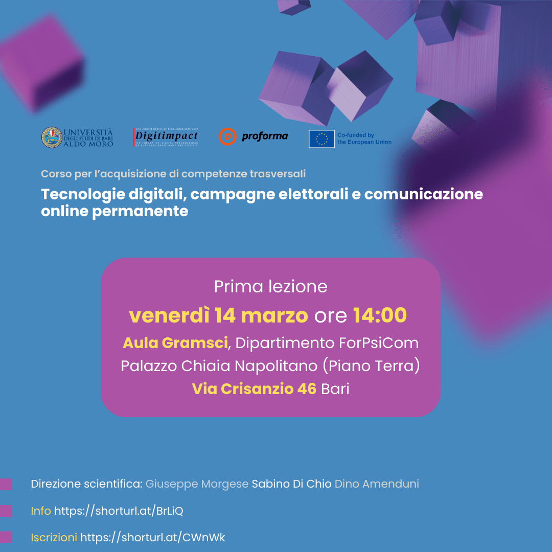 Il 14 marzo 2025 prende avvio nell’Università di Bari il corso di TECNOLOGIE DIGITALI, CAMPAGNE ELETTORALI E COMUNICAZIONE ONLINE PERMANENTE, diretto dai Professori Giuseppe Morgese e Sabino Di Chio e organizzato dal Centro di Eccellenza Jean Monnet DIGITIMPACT assieme all’agenzia Proforma. Il corso mira a trasmettere competenze sul corretto ed efficace uso delle tecnologie digitali […]